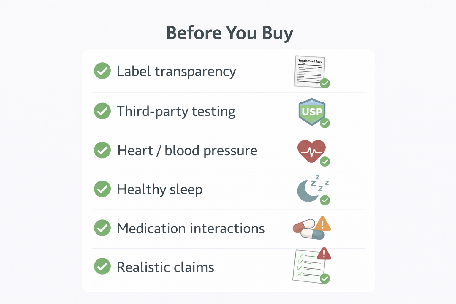 Run a safety check: blood pressure, anxiety, sleep issues, medications, pregnancy status. If any are relevant, do not guess.